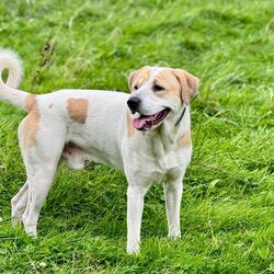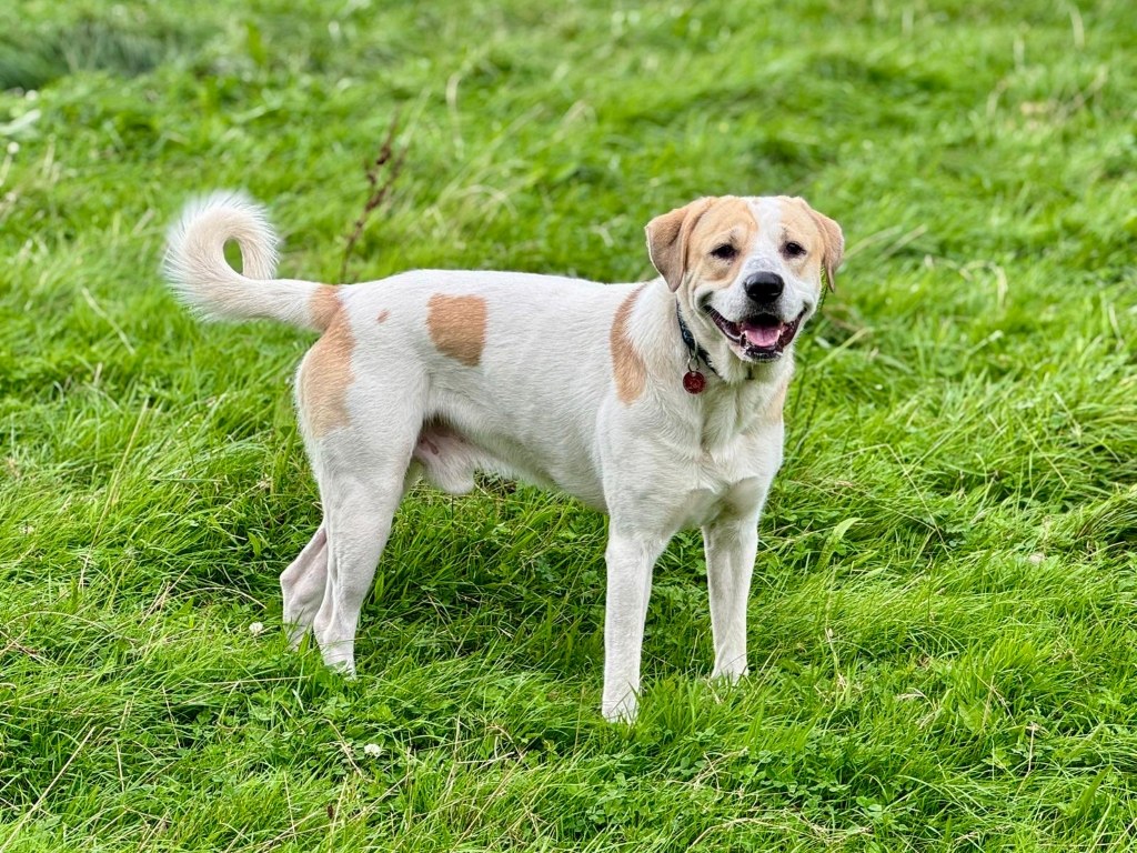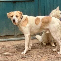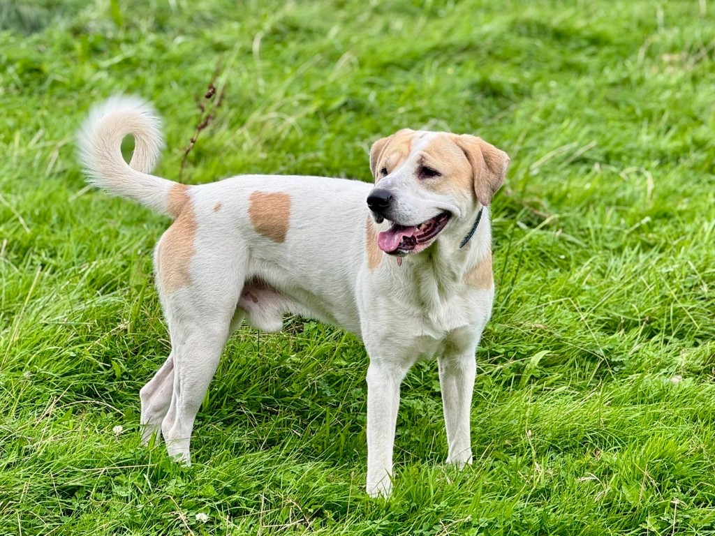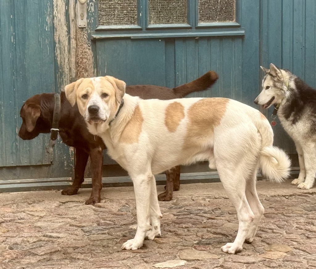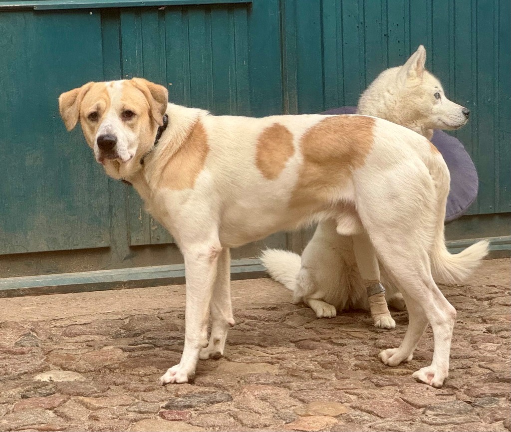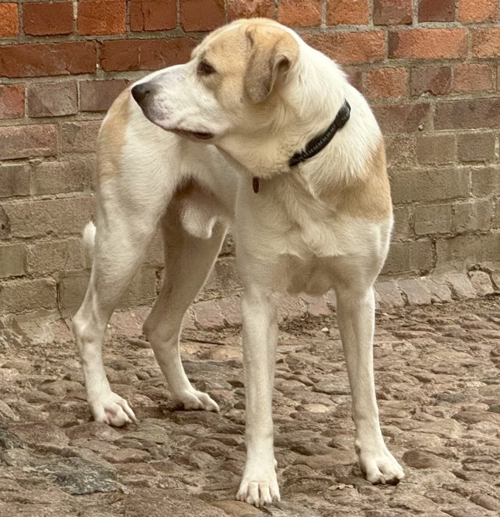 Moppi ist am 20. Dezember 2023 geboren und hatte keinen ganz glücklichen Start ins Leben. Sein Frauchen ist schwer erkrankt, dadurch hat er kaum etwas anderes als Haus und Garten kennengelernt und findet fremde Menschen und fremde Orte noch mächtig furchteinflössend. Zum Glück hat er mit zwei anderen Hunden zusammengelebt. Hunde findet er toll, egal ob klein oder groß. Am besten findet er es natürlich, wenn sie auf seine Spielaufforderung einsteigen. Moppi spielt trotz seiner Größe freundlich und sanft. Da merkt man, wieviel Fröhlichkeit und Lebenslust in ihm stecken. Ein Zweithund an dem er sich orientieren kann wäre dementsprechend eine Riesenhilfe für ihn. Fremden Menschen weicht er bevorzugt aus, sucht aber Nähe, wenn Ruhe eingekehrt ist und holt sich dann auch gerne eine vorsichtige Streicheleinheit ab. Laut Vorbesitzerin soll er ein Labrador Husky Mischling sein, wobei zumindest seine Mutter bekannt ist. Wir vermuten, dass ein Bernhardiner oder ein anderer Hund aus der Bigfoot-Liga seinen Teil beigetragen hat. Wir wünschen uns für den großen Schlacks ein eher ruhiges Zuhause, gelassene Menschen und gerne einen Hundekumpel.
